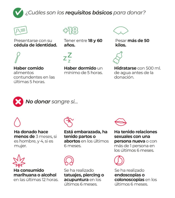 En cuanto a los requisitos, explican que pueden donar personas mayores de 18 años, con un peso superior a 50 kilos, que no hayan presentado enfermedades en las últimas dos semanas ni se hayan sometido a cirugías, ni a la realización de piercings o tatuajes en los últimos seis meses. Asimismo, es importante asistir habiendo ingerido alimentos —ya sea desayuno o almuerzo— y presentar la cédula de identidad al momento de la donación.