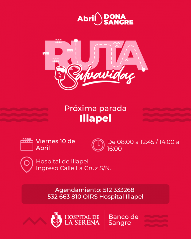 Un llamado a la solidaridad y al compromiso con la vida es el que realiza el Hospital Provincial de Illapel, que este viernes 10 de abril llevará a cabo una nueva jornada de donación de sangre junto al equipo del Banco de Sangre del Hospital San Juan de Dios de La Serena, en el marco de la estrategia “Ruta Salvavidas”.